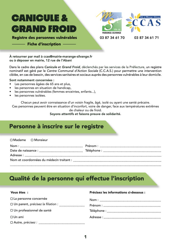 Dans le cadre des plans Canicule et Grand Froid, déclenchés par les services de la Préfecture, un registre nominatif est géré par le Centre Communal d’Action Sociale (C.C.A.S.) pour permettre une intervention ciblée, en cas de besoin, des services sanitaires et sociaux auprès des personnes vulnérables à leur domicile.
